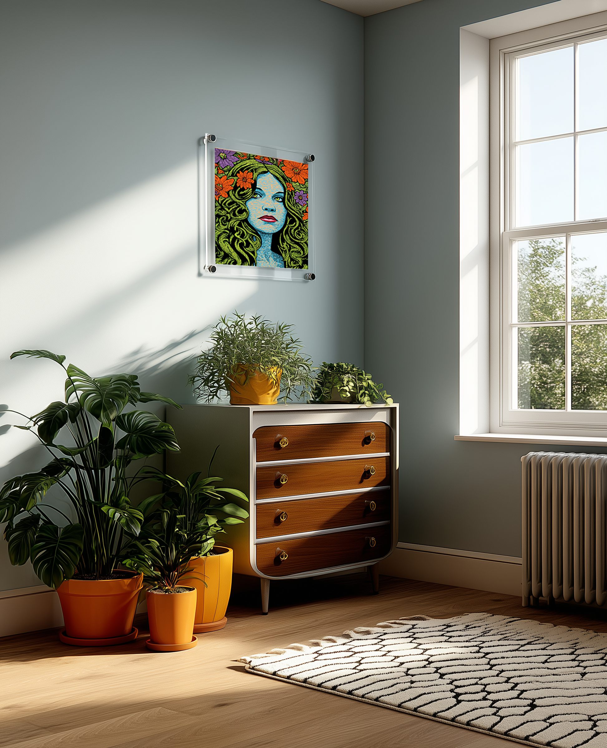 *************SIZING************* This frame is meant to fit art measuring 15x15 or smaller. Ideally your art should be 4" shorter in both directions compared to the size of the frame. For example this frame has a total size of 10x10 which is the optimal size for 6x6 art because it will create a 2" clear border on all sides. This frame will fit art measuring 4x4, 5x5, 6x6, and 7x7. Showcase your photos and art with this Easy-Hang Acrylic Frame. Standoff bolts set this frame 3/4" from the wall. Our unique bar and wire hanging design saves you from the painstaking process of drilling 4 holes into your wall at pinpoint locations. The mounting process is as simple as can be with a single hook and nail. TOTAL FRAME SIZE : 10x10 inches perfect for square art and photos. A 2 inch border on all sides is recommended. MATERIAL : Matching 3/16" thick cast acrylic sheets. Total thickness 3/8". STANDOFF BOLTS : Includes cap, barrel, and 2 clear washers. Choose from stainless steel or aluminum anodized bolts in 3/4 inch or 1 inch diameter. Both sizes will set frame 3/4" off wall. Available finishes include stainless steel, bronze, black, titanium, and gold. HARDWARE : Hanging hook and nail included.