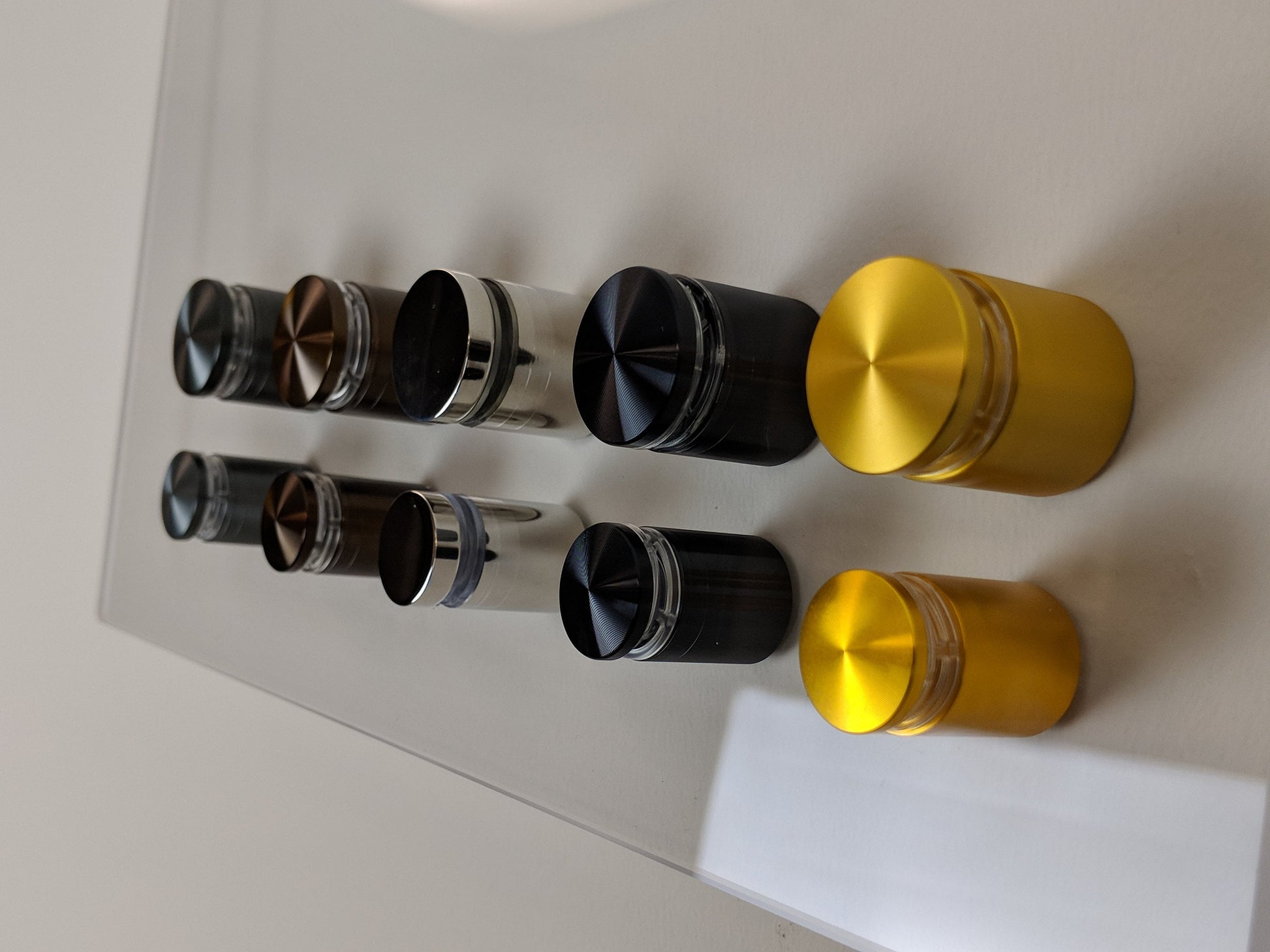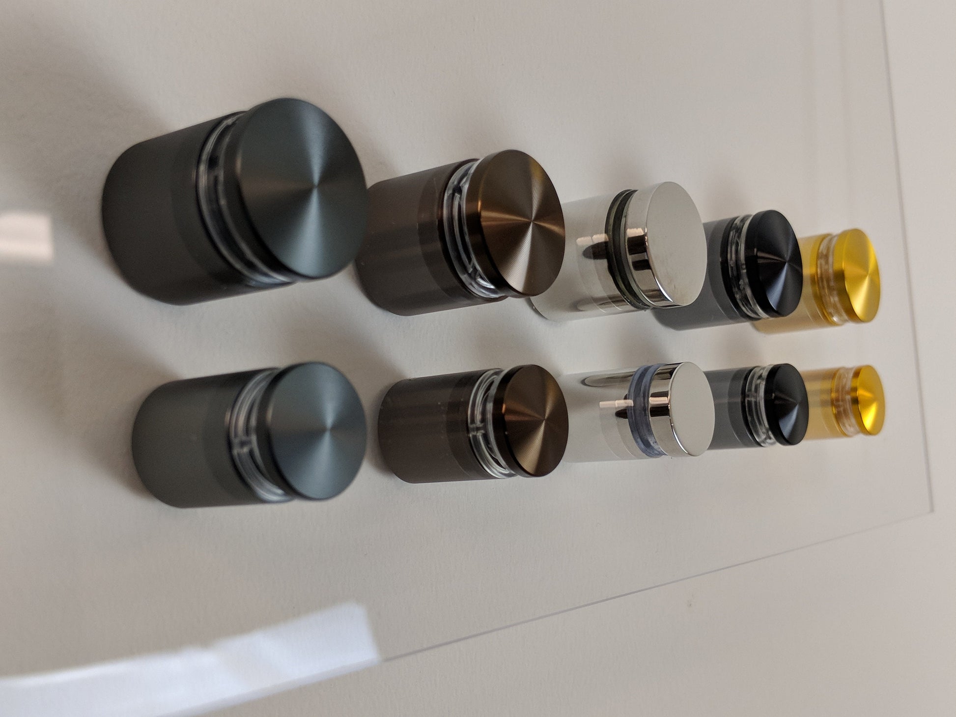 STANDOFF BOLTS : Includes cap, barrel, and 2 clear washers. Choose from stainless steel or aluminum anodized bolts in 3/4 inch or 1 inch diameter. Both sizes will set frame 3/4" off wall. Available finishes include stainless steel, bronze, black, titanium, and gold.