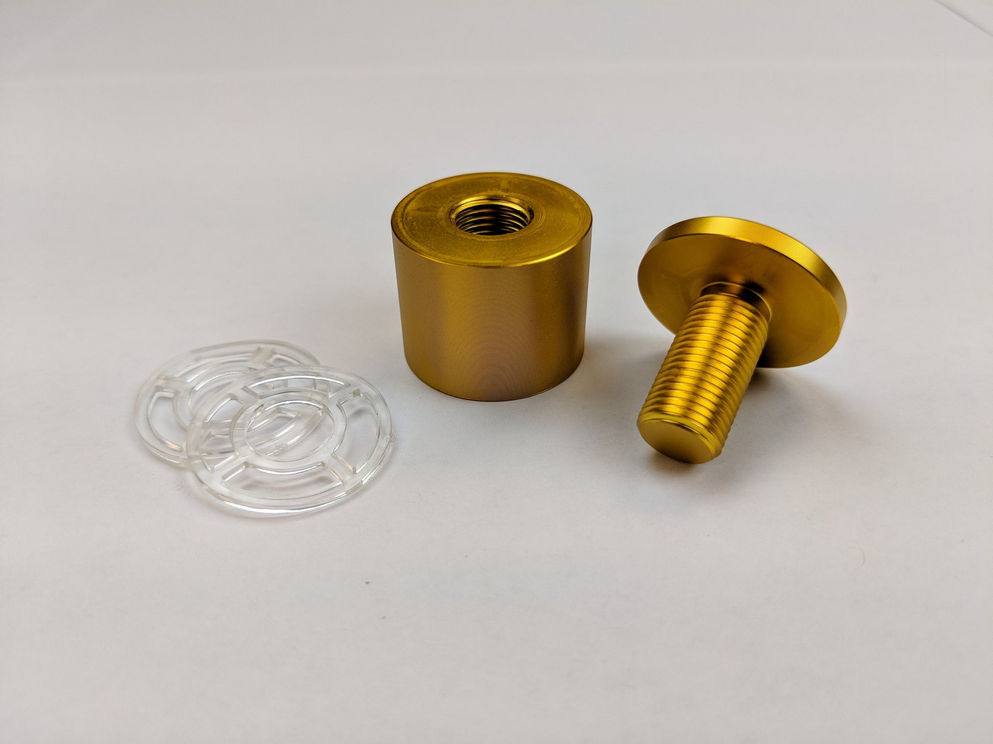 STANDOFF BOLTS : Includes cap, barrel, and 2 clear washers. Choose from stainless steel or aluminum anodized bolts in 3/4 inch or 1 inch diameter. Both sizes will set frame 3/4" off wall. Available finishes include stainless steel, bronze, black, titanium, and gold.